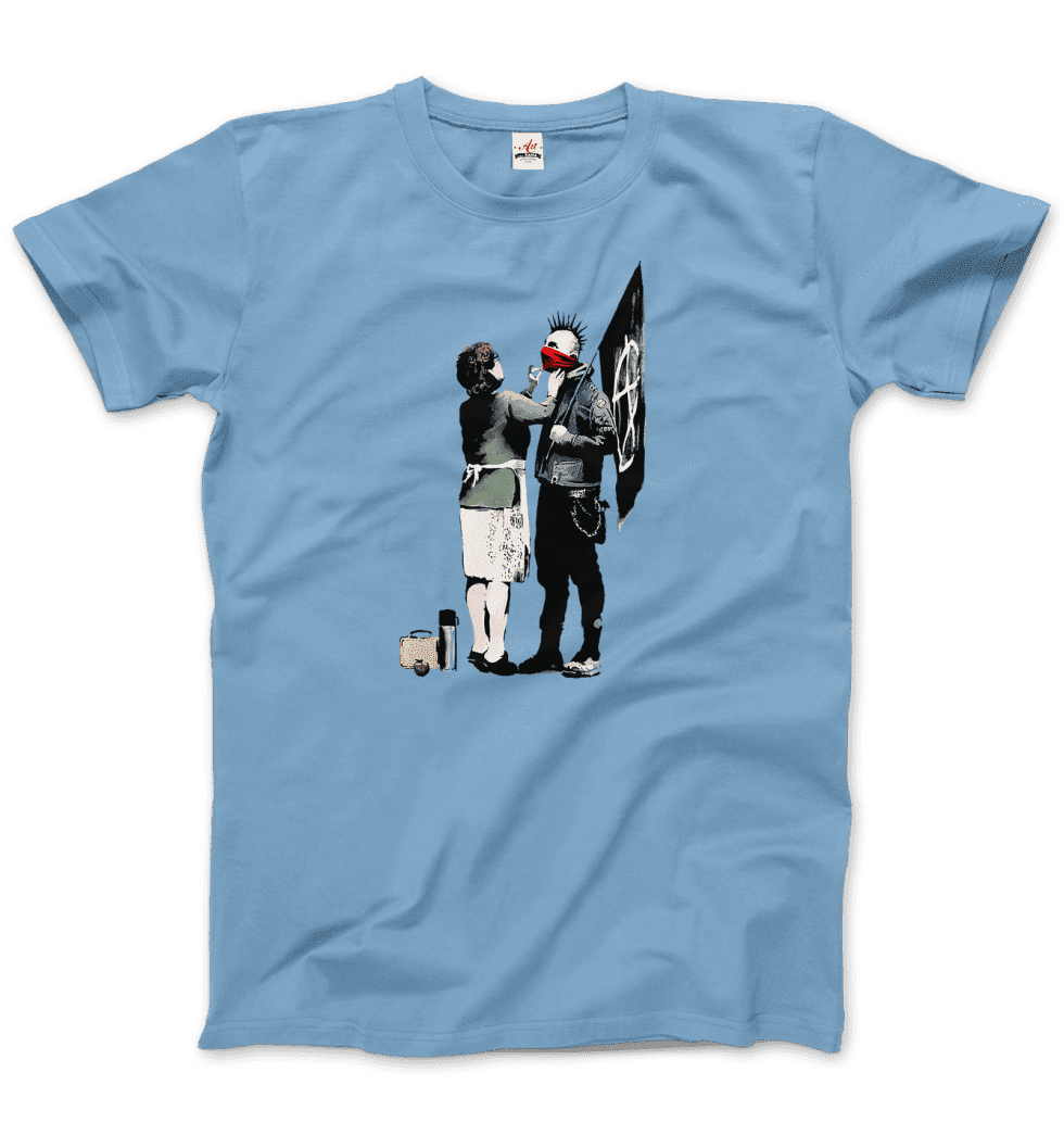This marvelous tee features a mother preparing her son, a punk, to go fight for what he wants. Banksy's satirical street art and subversive epigrams combine dark humor with graffiti executed in a distinctive stenciling technique and his works of political and social commentary have been featured on streets, walls, and bridges of cities throughout the world.